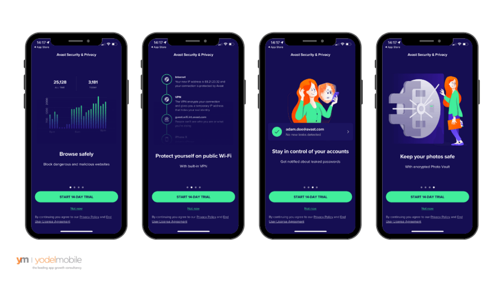 - Benefits-oriented onboarding: this concentrates on communicating the value proposition of an app. It generates excitement and uses emotional techniques to encourage users to engage in the concept before getting started. Avast Security app incorporates this type of onboarding to communicate the app’s benefits from the start with a strong focus on safety.