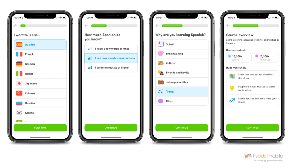 - Progressive onboarding: this allows users to learn about key app features in an intuitive way. This approach works particularly well if your app requires a registration process or profile building. Here’s a great example from Duolingo.
