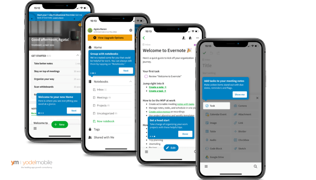 Here’s a good example of functional-oriented onboarding by Evernote. Its onboarding screens walk users through all the key product features, step by step, and make it easy for them to learn how to use the app correctly.